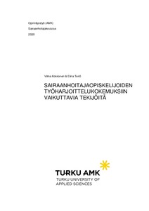 Sairaanhoitajaopiskelijoiden työharjoittelukokemuksiin vaikuttavia tekijöitä ovat opiskelijaohjaus, opiskelijaohjaaja, oppimisympäristö, opiskelijan oppiminen ja opiskelijan oma toiminta. Positiivisen työharjoittelukokemuksen muodostumiseen vaikuttavat opiskelijan ja opiskelijaohjaajan välinen hyvä vuorovaikutus, kannustava ja mukava opiskelijaohjaaja ja opiskelijan opiskelijaohjaajalta saama rakentava palaute. Lisäksi myönteinen ilmapiiri ja vastaanottavainen henkilökunta lisäävät opiskelijan viihtyvyyttä. Opiskelijan ollessa aktiivinen ja asenteen ollessa positiivinen myös työharjoittelukokemuksesta muodostuu helpommin positiivinen. Työharjoittelukokemukseen vaikuttavat negatiivisesti opiskelijan kohtaamat ongelmat opiskelijaohjaajan tai muun henkilökunnan kanssa, opiskelijan opiskelijaohjaajalta saama puutteellinen tai riittämätön ohjaus ja opiskelijoiden suuri määrä samalla osastolla. Harjoittelukokemukseen vaikuttavat negatiivisesti myös opiskelijan heikko tai puutteellinen lähtötilanne, asenne ja motivaatio. The purpose of this thesis was to find out factors influencing nursing students’ experiences of practical trainings and aim is to develop these training periods with the help of a literature review. In the thesis there was wanted to find out both positively and negatively influencing factors for practical trainings. The thesis was done as a literature review and 25 different sources was picked up in total (n = 25). The thesis was implemented as a inductive content analysis. The commissioner of this thesis was Turku University of Applied Sciences’ Tulos -project.