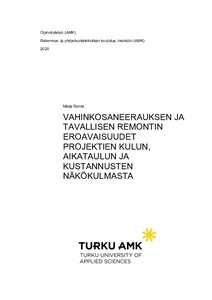 Vahinkosaneerauksen kestoon vaikutti olennaisesti kuivaustyö, joka voi kohteesta riippuen kestää viikkoja. Projektien aikatauluvertailussa vahinkosaneeraus oli kestoltaan pidempi perustuen pitkälti kuivaustyön kestoon. The aim of the thesis was to study the differences between damage repair and regular restoration. In the study the project course, schedule and costs were compared. The study subjects consisted of kitchen projects in which renovation work was carried out in an area of approximately 15 square meters. Only kitchen renovations were studied in the thesis, so that the amount of material studied remains moderate.