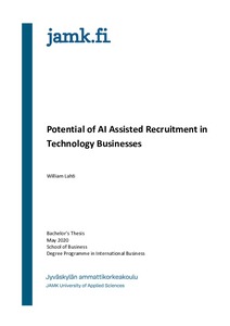 Tulokset kumpusivat primäärisestä aineistosta kahdeksan kvalitatiivisen haastattelun pohjalta, jotka olivat yhteydessä asetettujen tutkimuskysymysten kriteereihin. Selkeimpinä tuloksina olivat positiiviset sekä negatiiviset näkemykset, joissa tekoälyllä saattaa olla vaikutus tulevaisuuden rekrytointiin sekä perusteita olla ottamatta tai ottaa käyttöön kyseisiä ominaisuuksia tulevaisuuden rekrytointitoiminnassa. Johtopäätöksenä tutkimuksen nähtiin vastanneen asetettuihin tutkimuskysymyksiin kattavasti huolimatta tutkimuksen haasteista sekä rajoitteista. Tutkimus vahvistaa sen, mitä edeltävät samaa kenttää edustavat tutkimukset ovat ehdottaneet. Jatkotutkimukselle on edelleen tarve myös tulevaisuudessa. The rapidly changing world of technology creates new innovative possibilities for modern businesses. Many industries can benefit from various technological solutions created by these innovations. A current hot topic amongst those technologies is artificial intelligence. The overall potential of artificial intelligence is widely acknowledged, alongside the challenges that might be faced through the development of fourth industrial revolution.