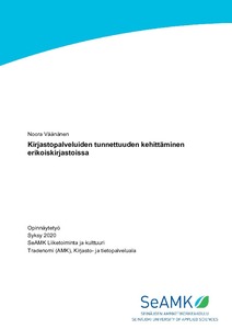 Opinnäytetyössä tutkittiin erikoiskirjastojen kokemuksia palveluidensa tunnettuudesta, sen kehittämisestä sekä siihen vaikuttavista tekijöistä. Tarkoituksena oli kartoittaa, kuinka erikoiskirjastot kokevat tavoittavansa omat kohderyhmänsä ja millaiset tekijät siihen vaikuttavat sekä millaisia tarpeita erikoiskirjastoilla on tunnettuutensa kehittämiseen liittyen.