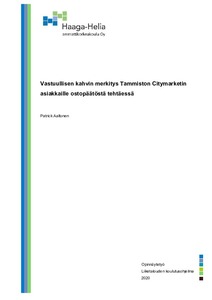 Tämän opinnäytetyön päätavoitteena oli selvittää, kuinka tärkeänä tekijänä Tammiston Citymarketin asiakkaat kokevat vastuullisuuden kahvituotteiden ostopäätöksen teossa. Tutkimuksessa selvitettiin myös mitkä ovat kuluttajien kolme tärkeintä vaikuttavaa tekijää kahvin ostopäätöksessä ja kuinka merkittävinä he kokevat nämä samat tekijät kahvituotteiden kohdalla. Työssä kartoitettiin myös vastuullisuussertifikaattien tunnettuutta ja Tammiston Citymarketin asiakkaiden valmiutta maksaa nykyistä keskihintaa enemmän vastuullisesti tuotetusta sertifioidusta kahvista. Tutkimuksen tärkeimpänä rajaavana tekijänä toimi sijainti, Vantaan Tammistossa sijaitseva