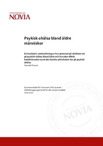 undersökning har samband mellan psykisk ohälsa och ensamhet varit påtaglig. Samband mellan fysisk aktivitet och psykiskt mående har även konstaterats. Besökshundens effekter på den äldres psykiska hälsa har även visats sig ha ett samband. The purpose of this thesis is to use qualitative interviews in order to research how the staff at retirement homes view mental illness, how mental illness is expressed among the elderly, what the staff consider is the impact of the therapeutic visitation dog on mental illness among the elderly, as well as the impact of physical activity on mental illness.