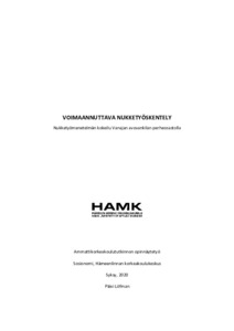 Työn tietoperustana käytettiin teoriaa voimaantumisesta, vanhemman ja vauvaikäisen lapsen vuorovaikutuksesta sekä nukketeatterista ja nukketyöskentelystä. Opinnäytetyö oli toiminnallinen ja se toteutettiin videovälitteisesti ohjattuna työpajatyöskentelynä kevään 2020 aikana. Tutkimusaineisto kerättiin alku- ja loppukyselyillä voimaantumisen taidoista sekä haastatteluilla, joihin vastasi kolme työskentelyyn osallistunutta vanhempaa. Lisäksi tutkimusaineistoa kerättiin havainnoimalla videomateriaalia lapsen ja vanhemman välisestä leikkihetkestä valmiin nuken kanssa. Analyysimenetelminä käytettiin teemoittelua ja luokittelua.