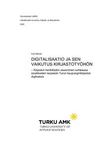 Tämän opinnäytetyön tarkoituksena oli selvittää miten Turun kaupunginkirjaston henkilöstön osaaminen vastaa asiakkaiden tarpeisiin digitaalisten palvelujen opastuksessa. Tavoitteena oli myös havainnollistaa miten digitalisaatio vaikuttaa kirjastotyöhön sekä kirjaston henkilöstön osaamisalueiden laajenemiseen.