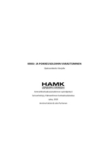Kriisi- ja poikkeusoloihin varautuminen pohjautuu lainsäädäntöön, joka määrittää varotoimet, valmiussuunnitelmat sekä huoltovarmuuden. Jotta yhteiskunnassa pystyttäisiin ylläpitämään optimaalisia elinolosuhteita tilanteesta riippumatta, on ajantasaisilla valmiussuunnitelmilla ja huoltovarmuudella merkittävä rooli palveluiden ylläpitämisessä ja materiaalien riittävyydessä. This Bachelor’s thesis is practice-based. It includes a theoretical knowledge basis and as a practice-based output of four instructional videos. The purpose of this thesis was to determine how the preparedness for crisis and emergency conditions occurs in Finland. The instructional videos will be part of an expert university diploma in crisis and derogation in cooperation between the universities of applied sciences of Häme and Southeastern Finland. The idea for this thesis was suggested by the Häme University of Applied Sciences.