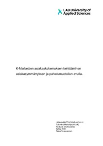 Opinnäytetyö käsittelee K-Marketin asiakaskokemusta kauppaympäristössä tapahtuvan asioinnin kautta. Keinona tähän käytetään palvelumuotoilun tarjoamaa systemaattista iteroivaa prosessia. Tarkastelun kohteena työssä on kaupassa asiakkaan asioinnista muodostuva palveluprosessi ja sen vaikutus asiakaskokemukseen. Lisäksi työssä keskitytään asiakkaiden, henkilökunnan ja kauppaympäristön väliseen vuorovaikutukseen. Tavoitteena on konkretisoida asiakaskokemusta palveluprosessin kehittämisen kautta ja lähestyä tätä kauppa- ja asiakastyyppien näkökulmasta. Samalla tarjotaan pohjaa, miten parantaa asiointiprosessia asiakkaille, jonka myötä myös asiakaskokemus kohenee. K-Market on valtakunnallinen päivittäistavarakauppa, joka tarjoaa elintarvikkeiden ohella tuotteita, joita kotitaloudet hankkivat lähes päivittäin, sekä muita palveluita, kuten posti- ja pakettipalvelut.