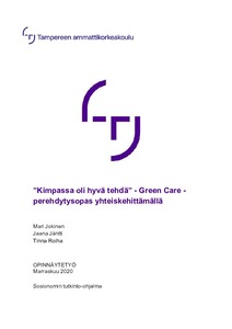 Toiminnallisen opinnäytetyön tavoitteena oli vahvistaa asiakkaan osallisuutta yhteisössään. Opinnäytetyön tarkoituksena oli tuottaa Green Care -perehdytysopas, joka soveltuu käytettäväksi yhteistyökumppaneiden yksikköihin. Opinnäytetyön kehittämistehtävänä oli asiakkaan osallisuuden parantaminen.