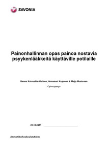Tämän opinnäytetyön tarkoituksena oli koota yhteen tutkittua tietoa painonhallinnasta ja yleisimmistä psyykenlääkkeistä, joiden mahdollisena haittavaikutuksena voi olla painon nousu. Opinnäytetyöhön valittiin käsiteltäviksi psyykenlääkkeistä mirtatsapiini, mianseriini, karbamatsepiini, ketiapiini, litium ja olantsapiini. Näitä psyykenlääkkeitä käytetään erilaisten psyykkisten sairauksien hoitoon. Työn toteuttajat valitsivat tarkemmin käsiteltäviksi masennuksen ja bipolaarisen mielialahäiriön. Opinnäytetyön tavoitteena oli laatia painonhallinnan opaslehtinen psyykenlääkkeitä käyttäville potilaille tiedon lisäämiseksi, mukaan annettavaksi ja työntilaajalle ohjauksen tueksi. Tavoitteena oli myös lisätä lääkehoidon hoitomyöntyvyyttä.