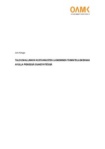 Opinnäytetyön aihe on syntynyt toimeksiantajan suurista taloushallinnon aiheuttamista kustannuk-sista. Toimeksiantajan yritys on pieni osakeyhtiö, mutta liiketoiminta on kuitenkin kasvanut paljon ja tilitoimiston suuret laskut yllättivät toimeksiantajan. Tästä syntyi idea lähteä tutkimaan eri vaihto-ehtoja taloushallinnon prosessien hoitamiseen ja miettiä niiden aiheuttamia kustannuksia. Tietoperusta koostuu toimintolaskennan ja taloushallinnon prosessien, etenkin pää- ja osakirjanpi-tojen teorioista. Näiden lähteinä on käytetty niihin liittyvää kirjallisuutta. Tämän tietoperustan pe-rusteella lähdetään muodostamaan toimintolaskentamalli, jossa tarkastellaan taloushallinnon kus-tannuksia tositteiden perusteella. Tutkimusmenetelmänä on siis toiminnallinen työ, jossa luodaan toimeksiantajalle laskuri taloushallinnon kustannuksia varten. Toiminnallisen työn tuloksena valmistui laskentapohja, jonka avulla tositteiden aiheuttamat kustan-nukset voitaisi laskea ainakin suuntaa antavasti. Tämän myötä tutkimuskysymyksille saatiin myös vastaukset. Johtopäätöksissä todetaan, että toimintolaskentaa voidaan käyttää taloushallinnon kustannusten selvittämiseen ja luetellaan mahdolliset resurssit, joita taloushallinnon prosessit vaativat. Näiden johtopäätösten myötä pohditaan, että mikä voisi olla toimeksiantajalle paras toimintamalli talous-hallinnon prosessien toteuttamiseen. Jatkotoimenpiteenä laskentapohjaa voidaan mahdollisesti tarkentaa ja tarkastella taloushallinnon kustannuksia eri näkökulmista.