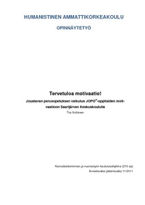 Opinnäytetyö käsittelee joustavan perusopetuksen vaikutuksia oppilaiden motivaatiossa Saarijärvelle syksyllä perustetussa JOPO®-luokassa. Tavoitteena on kartoittaa onko joustavalla perusopetuksella motivaatiota nostava vaikutus ja mitkä elementit JOPO®ssa vaikuttavat positiivisesti motivaatiotasoon. Opinnäytetyön tilasi Saarijärven Keskuskoulu tavoitteenaan kartoittaa JOPO®n vaikuttavuutta toiminnan jatkuvuutta ajatellen. Opinnäytetyön tutkimusmateriaali kerättiin pääasiassa kyselylomakkeilla, mutta apuna käytettiin myös havainnointia ja haastattelua. Opinnäytetyö ei ole yleistettävä, sillä vastaukset koostuivat kuuden ihmisen mielipiteistä ja kokemuksista. Tutkimustuloksia voivat kuitenkin hyödyntää muut kunnat, jotka ovat aloittamassa joustavan perusopetuksen toimintaa ja kaipaavat tukea valinnalleen. Kuten Saarijärvellä, myös muissa kunnissa tutkimustani voi käyttää tukena silloin, kun kaupungin päättäjiä yritetään saada JOPO®n puolelle. Työni antaa myös vinkkejä siitä, mitä ominai-suuksia joustavasta perusopetuksesta voi siirtää muihin perusopetuksen luokkiin.