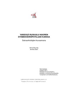 Tämän opinnäytetyön tarkoituksena oli selvittää sairaanhoitajien kuvaamana mitä yhdessä ruokailu syömishäiriöpotilaan kanssa on ja mitä se sisältää. Tarkoituksena oli myös selvittää hoitajien käyttämiä interventioita ja yhdessä ruo-kailun herättämiä tunteita. Opinnäytetyö tehtiin yhteistyössä Pirkanmaan sairaanhoitopiirin kanssa.