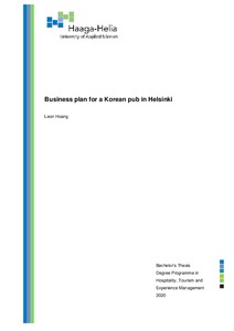 The purpose of this thesis is to create a business plan base for the Korean pub concept that the author can use as a reference for further developing a more detailed business plan or to open a business in the future. The business plan contains information the author thought is most important to include in this thesis. The Korean pub business will take inspiration from South Korean culture and cuisine. This is a response to the growing trend of South Korean entertainment that has piqued interest globally but is still very young as a big trend, so food and beverage businesses surrounding the topic are not saturated in Helsinki yet. The first three chapters will introduce the reader to various aspects of the Korean, -kitchen, -restaurant types, and last but not least the Korean pub. The theoretical framework introduces historical- and geological influences that are an important agent in the shaping of the Korean kitchen. Ingredients, condiments, meal structure, traditional drinks, Korean snacks, or Anju in Korean, and drinking etiquette are introduced to provide context for the next chapters. Then the text proceeds to present common types of Korean restaurants before getting into the chapter that familiarizes the reader with the Korean pub concept. The business plan includes very basic information such as company description, market analysis, competitive analysis, products & services, marketing strategy, operation, fund requirement, profitability calculation, and a break-even calculation.