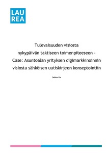 Tämän opinnäytetyön kehittämistyössä laadittiin kohdeyrityksenä toimivan asuntoalan konsernin käyttöön digitaalisen markkinoinnin visio, strateginen viitekehys, roadmap vuosille 2021-2022 sekä heti käyttöön otettava sähköisen uutiskirjeen konsepti. Opinnäytetyössä olennaista on koko prosessin kuvaus, joka lähtee käyntiin tulevaisuuden vision muodostamisesta edeten siitä tämän päivän tarpeisiin sopivan taktisen toimenpiteen toteutuksen kuvaukseen.