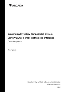 Inventory control is an essential activity for product-based companies like company A – a small manufacturer of fabricated metal products in Vietnam. The company’s inventory control practices are currently based on mere human’s estimation, without theoretical base and depends on inefficient manual processes to manage their inventories. Based on Inventory Management theories: Just-In-Time (JIT) and Materials Requirements Planning (MRP) as foundation knowledge, the thesis project examined the company’s inventory activities and developed a computer-based inventory solution. Constructive action research approach was conducted via virtual meetings and discussions with the company to investigate their current inventory control practices and to construct a suitable inventory solution; and thus, the project created an Inventory System using VBA-Excel spreadsheets to help replace current manual inventory work. The application solution will be publicly shared to other small businesses which do not have sufficient resources to implement an inventory software system.