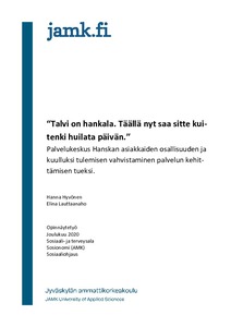 "Talvi on hankala. Täällä nyt saa sitte kuitenkin huilata päivän." Palvelukeskus Hanskan asiakkaiden osallisuuden ja kuulluksi tulemisen vahvistaminen palvelun kehittämisen tueksi.