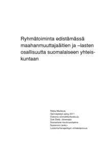 Markkula, Riikka. Ryhmätoiminta edistämässä maahanmuuttajaäitien ja –lasten osallisuutta suomalaiseen yhteiskuntaan. Järvenpää, syksy 2011, 53 s., 2 liitettä. Diakonia-ammattikorkeakoulu, Diak Etelä Järvenpää. Sosiaalialan koulutusohjelma. Lastentarhanopettajan virkakelpoisuus, sosionomi (AMK).