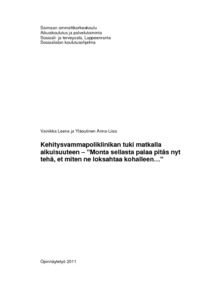 Tämän opinnäytetyön tarkoituksena oli selvittää vuoden 2010 alussa toimintansa aloittaneen Etelä-Karjalan sosiaali- ja terveyspiirin kehitysvammapoliklinikan palvelun merkitystä asiakkaille. Erityishuoltopiiriin kuuluvat kaikki Etelä-Karjalan kunnat. Tavoitteena oli selvittää, millaista tukea nykyinen kehitysvammapoliklinikka on antanut asiakkaille, missä ja kenen kanssa asiakkaat olivat asioineet aikaisemmin. Lisäksi selvitettiin asiakkaiden tulevaisuuden toiveita, odotuksia ja kehittämisehdotuksia poliklinikan palveluihin. Toimintaa haluttiin kehittää ja kehittämistyöhön haluttiin lisää asiakaslähtöisyyttä.