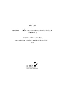 Tämän opinnäytetyön aiheena oli suunnitella ja toteuttaa asiakastyytyväisyyskysely teollisuusyritys X:lle. Kysely oli suunnattu yrityksen tuotejärjestelmä X:ä jälleenmyyville nykyisille avainasiakkaille. Asiakkaat koostuivat lähinnä urakoitsijoista sekä vähittäisliikkeistä. Teollisuusyritys X ei ole aikaisemmin teettänyt asiakastyytyväisyyskyselyä pelkästään tuotejärjestelmä X:n asiakkaille, joten yrityksellä oli tarve selvittää kyseisen sektorin asiakkaiden tyytyväisyyttä.