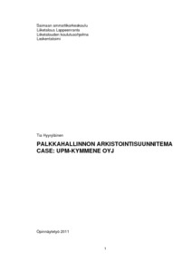 Opinnäytetyön tarkoituksena oli tehdä UPM-Kymmene Oyj:n palkkahallinnolle arkistointisuunnitelma. Arkistointisuunnitelman tekemiseen päädyttiin, koska aiempi arkistointisuunnitelma oli kovin suppea palkkahallinnon osalta, sekä osin aika vaikea ymmärrettävä. Tavoitteena oli saada esille mahdollisimman tehokkaasti arkistoinnin käytäntöjä palkkahallinnon näkökulmasta, sekä saada yrityksen käyttöön sellainen arkistointisuunnitelma, jotta syntyvät asiakirjat voitaisiin arkistoida mahdollisimman tehokkaasti ja palkanlaskijan näkökulmasta helposti, ilman että turhia asiakirjoja enää arkistoitaisiin.