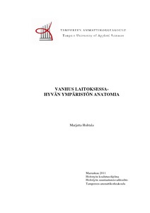 Opinnäytetyöni tarkoituksena oli selvittää, minkälainen on hyvä fyysinen, kulttuurinen ja sosiaalinen ympäristö vanhuksille vanhustenhoitolaitoksessa. Tavoitteena oli tuottaa tietoa, jota hoitajat voivat vanhustenhoitolaitoksissa työskennellessään käyttää hyväkseen hyvän fyysisen, kulttuurisen ja sosiaalisen ympäristön luomiseksi ja parantamiseksi. Opinnäytetyöni tehtävänä oli selvittää, minkälaisten aistien avulla ympäristö koetaan ja miten vanheneminen vaikuttaa aistien toimintaan, mitä erityispiirteitä vanhuksen ympäristössä on otettava huomioon, sekä mistä tekijöistä hyvä fyysinen, sosiaalinen ja kulttuurinen ympäristö vanhustenhoitolaitoksessa koostuu.