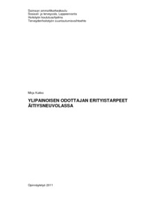 Opinnäytetyön tavoitteena oli haastatella äitiysneuvolassa työskenteleviä terveydenhoitajia ja koota heidän näkemyksensä ylipainoisen odottajan erityistarpeista äitiysneuvolassa. Työ koostuu kolmesta kokonaisuudesta, jotka tukevat toisiaan. Ensimmäisessä osassa käsitellään ylipainon vaikutusta raskauteen ja neuvonnan merkitystä äitiysneuvolatoiminnassa. Tutkimusosassa kuvataan käytettyjä tutkimusmenetelmiä ja tutkimuksen kulkua. Tutkimustulokset esitetään omassa osiossaan. Pohdintakappaleessa käydään läpi tutkimuksen kulku ja tutkimustulokset verraten niitä teoriatietoon, sekä pohditaan tutkimuksen onnistumista, menetelmän valintaa sekä mahdollisia jatkotutkimusaiheita.