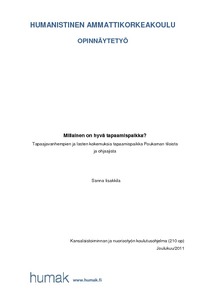 Opinnäytetyöni tilaaja on Kanta-Hämeen perhetyö ry:n Tapaamispaikka Poukama. Tapaamispaikka Poukamassa järjestetään valvottuja sekä tuettuja tapaamisia lapsille ja heistä erossa asuville vanhemmille. Opinnäytetyön tavoitteena oli selvittää, millainen on hyvä tapaamispaikka tapaamispaikan asiakkaiden näkökulmasta. Tapaamispaikkaa tarkastellaan sen fyysisten tilojen ominaisuuksien sekä ohjaajien perusteella.