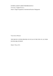 The aim of this explorative case study is to make the phenomenon of unemployed master’s students recognized and to find out what kind of expectations the unem-ployed MBA students of KyUAS had when they entered the studies, and how the customer service system process of the institute matched with these expectations and the customer needs. The difficulties in finding a subject for the thesis are discussed as well as the development of the service processes of the MBA studies.