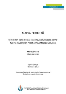 Opinnäytetyön tarkoituksena on tutkia Jyväskylän maahanmuuttajapalveluiden tarjoamaa maahanmuuttajien lastensuojelullista perhetyötä asiakkaiden kokemusten kautta. Lisäksi tarkoituksena on selvittää, miten Malva-perhetyö toteutuu käytännön tasolla ja mitkä lait ohjaavat toimintaa. Opinnäytetyön toimeksiantajana on Jyväskylän kaupungin maahanmuuttajapalvelut. Tutkimus auttaa Jyväskylän maahanmuuttajapalveluita saamaan lisää tietoa Malva-perhetyöstä sekä samalla saamaan kirjallista materiaalia, koska Malva-perhetyötä ei ole aikaisemmin tutkittu. Lisäksi haastattelujen perusteella voidaan tehdä varovaisia arvioita Malva-perhetyön vaikuttavuudesta.