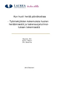 Opinnäytetyön tarkoituksena on kuvata päiväkodin henkilökunnan kokemuksia lastensuojelullisen huolen heräämisestä sekä lastensuojeluilmoituksen teon vaiheista. Opinnäytetyön idea