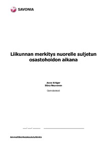 Opinnäytetyössä selvitetään millaisia keinoja ja mahdollisuuksia Niuvannimen sairaalan NEVAn hoitohenkilökunnalla on liikunnan toteuttamiseen omahoitajasuhteen aikana ja mitkä asiat vaikuttavat liikunnan toteutumiseen. Kuinka liikkuminen toteutuu suljetun osastohoidon aikana, kun nuoren omaa liikkumisvapautta ja itsemääräämisoikeutta rajoitetaan? Opinnäytetyö tuo esiin hoitajien kokemuksia ja näkemyksiä hoidossa olevien nuorten liikunnan toteutuksesta.