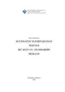 Opinnäytetyön aiheena oli syventyä vuonna 2009 julkaistuun IEC 60255-151 -standardiin, joka käsitteli mittaavien releiden ja suojauslaitteiden toiminnallisia vaatimuksia yli- ja alivirtasuojaukseen. Tutkimisongelma oli, että kuinka testausmenetelmien suorittaminen tulisi tehdä suunnatulle ylivirtalohkolle IEC 60255-151 -standardin mukaisesti. Testiympäristöksi valittiin ABB:n sisäinen testausjär-jestelmä ATS, koska se oli valmis testiympäristö, ja sen toiminnallisuus oli parempi kuin muissa mahdollisissa ratkaisuissa. Tutkimuksen tavoitteena oli laatia vaaditut testifunktiot ATS-järjestelmään ja testata REF615-johdonsuojareleen suunnatut ylivirtalohkot.