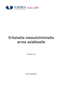 Opinnäytetyössäni tavoitteena oli auttaa yritystä löytämään, mitkä messutoimintaprosessin vaiheet luovat asiakkaille arvoa. Tarkoituksena oli pyrkiä kehittämään Yritys XX:n palvelua. Tarkoituksena oli myös tuottaa tutkimus, jonka tuloksia yritys voi käyttää palveluiden myyntityössä. Teoreettinen viitekehys rakentuu menekinedistämisen, messutoiminnan ja arvon luomisen ympärille. Apunani käytin myös 4P–mallin teoriaa.
