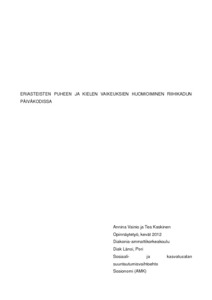 Vainio, Annina & Kaskinen, Tea. Eriasteisten puheen ja kielen vaikeuksien huomioiminen Riihikadun päiväkodissa. Pori, kevät 2012, 51s., 5 liitettä. Diakonia-ammattikorkeakoulu, Diak Länsi, Porin toimipaikka, Sosiaalialan koulutusohjelma, Sosionomi (AMK) + lastentarhanopettajan virkakelpoisuus.