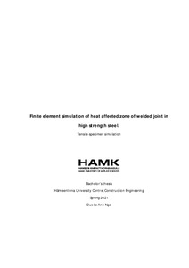 This Bachelor’s thesis is commissioned by HAMK Tech, a research unit in Häme University of Applied Sciences. The research topic of this thesis is a part of a bigger research project on high strength steel applications and welded connections. The main goal is to create finite element models of a S500 tensile specimen test. This thesis is the direct continuation work of a previous thesis research topic on finite element modelling of heat affected zone and another on the experimental tests of the effect of different heat inputs on welding of high strength steel.