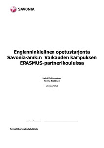 Tämän opinnäytetyön tarkoituksena oli selvittää Savonia-ammattikorkeakoulun Varkauden kampuksen Erasmus-partnerikorkeakoulujen englanninkielisen opetustarjonnan määrä tutkimushetkellä. Loppuyhteenvetona koottiin kartta Erasmus-partnerikorkeakoulujen englanninkielisistä kursseista. Karttaa on mahdollista muokata tulevaisuudessa sitä mukaa kun uusia kursseja tai yhteistyökouluja tulee. Kartan on tarkoitus olla opiskelijoiden apuväline vaihtomaata valittaessa. Tarkoitus myös olisi, että karttaa päivitettäisiin sitä mukaa, kun kurssit ovat tiedossa. Toiveissa on, että vaihtoon lähtevät opiskelijat hyötyvät myös opinnäytetyöstä, jossa on lueteltuna kohdemaita, sekä tarkennettu Erasmus-ohjelmaa ja siihen liittyviä kokemuksia.