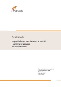 Opinnäytetyön tarkoituksena oli selvittää kansainvälisen, systemaattisen kirjallisuuskatsauksen avulla, mitä hyväksi havaittuja kognitiivisten toimintojen arviointimenetelmiä käytetään toimintaterapiassa arvioitaessa aikuisia, kognitiivisista häiriöistä kärsiviä asiakkaita.