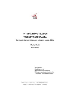 Opinnäytetyön tarkoituksena oli tehdä perehdytyskansio Hatanpään sairaalan sisätautiosastolle B5 rytmihäiriöpotilaan telemetriaseurannasta. Työmme tehtävinä oli selvittää yleisimmät rytmihäiriöt ja miten niitä hoidetaan, miten telemetrialaitetta käytetään sekä millainen on hyvä perehdytyskansio. Näistä koostuvat myös työmme teoreettiset lähtökohdat. Opinnäytetyömme on tuotokseen painottuva ja kaksiosainen. Ensimmäinen osa on raportti, joka sisältää työn teoreettiset lähtökohdat, ja toinen osa on varsinainen tuotos.