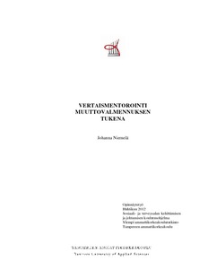 Opinnäytetyön tavoitteena oli kuvata muuttovalmennusprosessi ja vertaismentoroinnin hyödyntäminen Kangasalan kunnan kehitysvammahuollon muuttovalmennuksessa. Tutkimustehtävänä oli selvittää, soveltuuko vertaismentorointi muuttovalmennuksen tueksi, ja miten sen avulla voidaan tukea kehitysvammaisen muuttajan omaisia. Tässä opinnäytetyössä haluttiin hyödyntää kehitysvammaisten ihmisten omaisten kokemusasiantuntijuutta muuttamiseen liittyvissä kysymyksissä ja kehitysvammapalveluiden kehittämisessä, sekä haluttiin tarjota omaisille psykososiaalista tukea vertaismentoroinnin avulla. Omaisten vertaismentorointiryhmien keskusteluista vietiin kehittämisehdotuksia myös henkilöstölle, jolloin omaiset toimivat myös välillisesti ammattihenkilöstön mentoreina. Aineiston keruu toteutettiin teemahaastatteluina syksyllä 2011 vertaisryhmissä, joihin osallistui vertaismentorin roolissa olleita omaisia sekä uuteen asumisyksikköön muuttajien omaisia. Analyysimenetelmänä käytettiin laadullista, aineistolähtöistä sisällönanalyysiä.