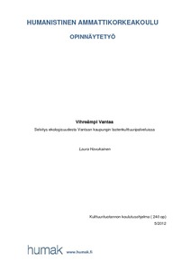 Tässä opinnäytetyössä on selvitetty, miten ekologisuus näkyy Vantaan kaupungin lastenkulttuuripalveluissa. Lastenkulttuuripalveluiden arvoihin on kirjattuna, miten ekologisuus tulee ottaa toiminnassa huomioon. Opinnäytetyössä tutkittiin, toteutuvatko arvot.