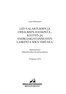 Tämä opinnäytetyö käsittää Mikkelin Toriparkin led-valaistuksen ja valaistuksenohjauksen hankinta-, käyttö- ja energiakustannusten laskennan sekä vertailun. Työ on tehty yhteistyössä Mikkelin alueen YIT Kiinteistötekniikan kanssa, joka vuosien 2009–2011 aikana toteutti sähköistyksen Mikkelin Toriparkkiin. Aikomuksena oli jo alun perin vuonna 2010 toteuttaa valaistus led-tekniikalla, mutta toteutus kariutui silloisen led-tekniikan epävarmuustekijöiden, kuten eliniän, kestävyyden ja valonlaadun vuoksi.