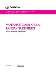 Video tehtiin mahdollisimman yksiselitteiseksi ja helposti ymmärrettäväksi, jotta kynnys käyttää kriteerejä ensihoidossa, olisi mahdollisimman alhainen. This thesis is a functional thesis, the output of which was a video for Savonia University of Applied Sciences. The video was targeted at Savonia University of Applied Science students, paramedics and firefighters. The goal of the thesis is to facilitate the decision making about the need for supporting the trauma patient´s cervical vertebrae and thus to improve the patient care by improving paramedics´ expertise as a whole. The video was made for Savonia University of Applied Sciences but it can be used by other educational organisations and emergency services. The video was also uploaded to YouTube for everyone.