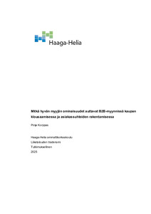 (2025)Tämän opinnäytetyön tavoitteena on tutkia B2B-myyjien hyviä ominaisuuksia. Tutkimuksessa esitellään useita ominaisuuksia, joiden avulla myyjä voi menestyä B2B-alalla. Lisäksi tutkitaan koko B2B-myyntiprosessia, jossa ... -