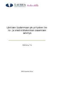 Tämän opinnäytetyön tavoitteena oli selvittää läntisen Uudenmaan pk-yrityksien tieto- ja viestintätekniikan osaamisen taso. Tämä selvitys tapahtuu yrittäjille lähetetyn tieto- ja viestintätekniikan osaamisen tutkimuskyselyllä. Tutkimuksessa keskityttiin pk-yritysten perustietojen lisäksi tietoyhteiskunnan viestintävalmiuksien mukaan käytettyihin välineisiin ja liittymiin, osaamiseen sekä motivaatioon. Kyselylomakkeen runko luokittuu neljään eri pääryhmään: taustatietoihin, laitekohtaisiin tietoihin, sovellustietoihin eli ohjelmien käyttöön ja tarjottaviin palveluihin sekä osaamiseen ja motivaatioon liittyviin kysymyksiin.