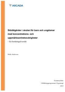 Syftet med detta examensarbete är att kartlägga vilka stödåtgärder i skolan som finns dokumenterade i forskning, för barn och ungdomar med koncentrations- och uppmärksamhetssvårigheter på den grundläggande utbildningsnivån (årskurs 1-9). Fokus ligger på tre områden; person, miljö och aktivitet. Arbetet genomfördes som en systematisk litteraturstudie i form av en forskningsöversikt, artiklarna kvalitetsgranskades med hjälp av Forsberg & Wengströms (2008) granskningsprotokoll och resultaten analyserades enligt modellen för innehållsanalys. Som teoretisk referensram användes ”The Person-Environment-Occupation Model” (PEO-modellen).