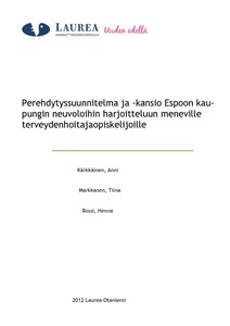 Opinnäytetyön tarkoitus on tuottaa kattava ja tiivis perehdytyskansio Espoon Kaupungin neuvoloihin meneville terveydenhoitajaopiskelijoille. Perehdytyskansion tavoitteena on antaa tietoa ja turvallisuutta opiskelijalle neuvolajakson alkaessa ja sen edetessä. Perehdytyskansion tavoitteena on lisäksi nopeuttaa opiskelijan oppimista sekä helpottaa ohjaajan roolia harjoittelun aikana. Perehdytyskansio tulee sähköisessä muodossa Laurea -ammattikorkeakoulun terveydenhoitajaopiskelijoiden työtilaan Optimaan sekä Espoon kaupungin neuvoloiden käytettäväksi.