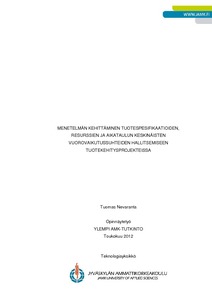 Opinnäytetyön tavoitteena oli kehittää menetelmä, millä voidaan vähentää tuotekehitysprojekteissa olevia riskejä tuotespesifikaation, resurssien ja aikataulun vuorovaikutusten suhteen. Menetelmiä täytyi tehostaa erityisesti tuotekehitysprojektin määrittelyvaiheessa ja tuotekehitysprojektin edetessä. Työ aloitettiin tutkimalla tuotekehitysprojektien tuotespesifikaatioiden, resurssien ja aikataulun määritelmiä. Valtralla tutustuttiin tuotekehityksen nykyisiin toimintatapoihin ja käytettävissä oleviin työkaluihin.
