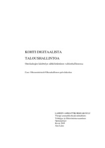 Taloushallinnon sähköistäminen on ajankohtainen haaste valtionhallinnossa. Sen vuoksi olen valinnut opinnäytetyöni aiheeksi sähköisen ostolaskujärjestelmän käyttöönoton valtionhallinnon näkökulmasta. Opinnäytetyössä esitellään sähköisen laskujen ja asiakirjojen kierrätyksen sekä arkistoinnin järjestelmän käyttöönottoprojekti Oikeusministeriössä. Opinnäytetyön tarkoituksena on esittää järjestelmän käyttöönoton vaikutus menojen maksamisen - prosessiin.