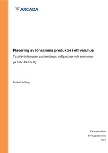 IKEA Oy är för tillfället ett av de ledande möbelföretaget på marknaden. Produktsortimentet ändras ett par gånger om året och dessutom ökar antalet produkter ständigt. Detta slutarbete görs som uppdrag för Esbo IKEA. Esbos varuhus är ett av de minsta IKEA-varuhusen till yta, vilket har gjort att placering av produkter blivit en mycket viktig del av verksamheten. Syftet med detta arbete är att med olika ABC-analyser och ABC-modeller få fram de mest lönsamma produkterna och ge en rekommendation på hur man kunde placera dem på de bästa försäljningsplatserna inom textilavdelningens område med gardinstänger, rullgardiner och persienner. Lönsamhet betyder ett gott ekonomiskt resultat, med andra ord att intäkterna är större än kostnaderna. Att t.ex. jämföra den enskilda produktens täckning med försäljning får man fram de lönsamma produkterna. Platsen eller placeringen av produkten är mycket viktig för att man skall kunna styra kunden till produkter man vill sälja, t.ex. produkter med hög lönsamhet. Med att undersöka planlösningen i t.ex. ett varuhus och göra kundrörelsemätningar kan man få ut hot spots, d.v.s. de mest besökta områdena på ett visst område. En ABC-analys baserar sig på Paretos 80/20-regel, där 20 % av ett företags produkter är 80 % av företagets omsättning. Genom att använda flera dimensioner, t.ex. lönsamhet och försäljning, får man en dubbel ABC-analys med vilken man får ut mera exakta värden. I detta arbete används kvantitativ undersökningsmetod av både kvantitativ- och kvalitativ karaktär. Med en kvantitativ undersökningsmetod räknar man utifrån statistik och data. Om undersökningen är av kvalitativ karaktär är det dessutom tolkningsinriktat. I detta arbete har det gjorts en dubbel ABC-analys på produkternas lönsamhet och försäljning, samt en ABC-uppdelning av försäljningsplatserna på textilavdelningens gardinstänger, rullgardiner och persienner. Utifrån resultaten rekommenderas ett sätt att placera de mest lönsamma produkterna på de bästa försäljningsplatserna. IKEA Oy is today one of the leading furniture company’s on the market. The wide range of products is changing a couple of times a year and the amount of products are constantly increasing. This degree thesis is done as an assignment for Esbo IKEA. The Esbo store is one of the smallest IKEA stores in the world by surface, which has made placing of products more important for the company´s operation. The purpose of this thesis is to find the most profitable products with the best sales by using different ABC-analysis´s and ABC-models and give a recommendation how to place the products on the best sales places in the textile department’s curtain rods, blinds and roller blinds. Profitability means a good economic result, in other words that earnings are bigger than costs. By comparing for example a products margin with its sales, makes it possible to get the most profitable products. The place or the placing of the product is very important when steering the customers to the products you want to sell, for example the profitable products. By studying for example a store´s layout and by measuring the customer flow you get hot spots, which are the most visited places in an area. An ABC-analysis in based on Pareto´s 80/20-rule, where 20 % of the company´s products are 80 % of the company´s turnover. By using different dimensions, for example profit and sales, you get a double ABC-analysis with more precise values. This thesis is made by a quantitative investigation method and with both a qualitative and a quantitative character. With a quantitative method you count and investigate on statistics and data. If the thesis is of qualitative character then the data has been interpreted. In this thesis has a double ABC-analysis been made on products profits and sales and the sales spaces has been divided by an ABC-model on the textile department´s section with curtain rods, blinds and roller blinds.