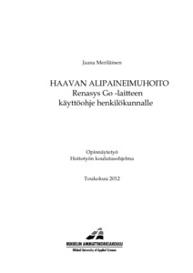 Opinnäytetyön tarkoituksena on tuottaa terveyskeskuksen henkilökunnan käyttöön kuvallinen käyttöohje haavan alipaineimuhoidon toteuttamisesta Renasys Go- laitteella. Työn tavoitteena on helpottaa hoitajan työskentelyä selkeän ohjeen avulla.