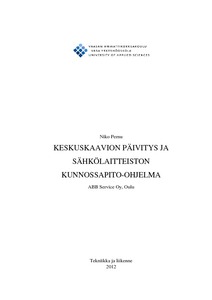 Opinnäytetyön tavoitteena oli päivittää ABB Service Oy Oulun sähköpääkeskuksen keskuskaavio ja luoda kunnossapito-ohjelma sähkötiloissa sijaitseville keskijännitekojeistolle, sähköpääkeskukselle, kompensointilaitteistolle ja turvavalaistukselle. Päivitys oli ajankohtainen, koska keskuskaavio ei vastannut enää muutoksia kokenutta pääkeskusta. Samoin varsinaista kunnossapito-ohjelmaa laitteistoille ei ollut olemassa.